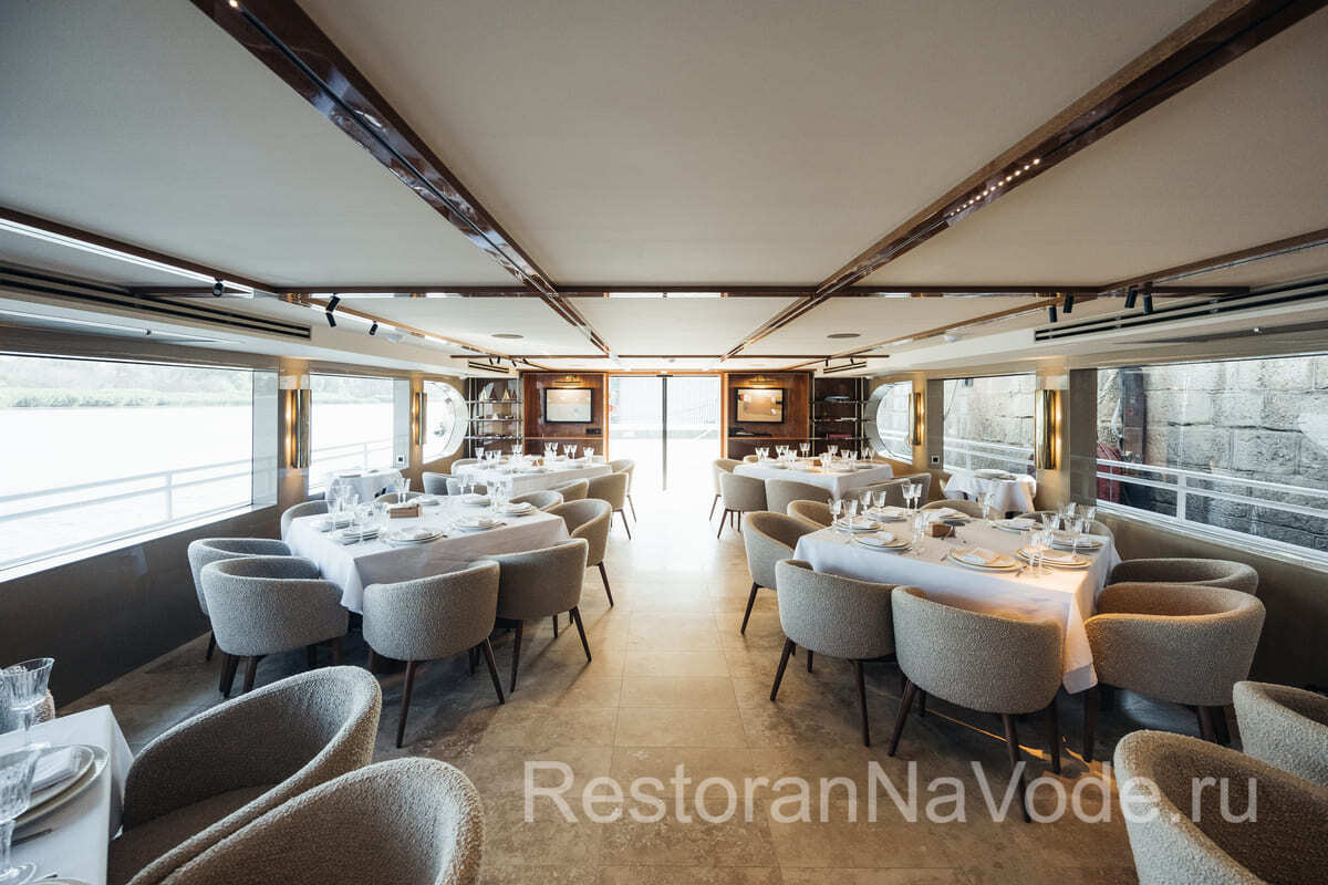 На нижней палубе расположен основной зал-ресторан, оборудованный мультимедийной техникой, оригинальными столами и мягкой мебелью. Современный стиль внутреннего убранства поражает своей блестящей роскошью. Гармоничность экстерьера, внутренней отделки и меблировки корабля Калипсо создает впечатление, что вы отдыхаете не на прогулочном теплоходе, а на фешенебельной яхте. Особый шик банкетному залу придают стильная посуда и дизайнерские интерьеры.