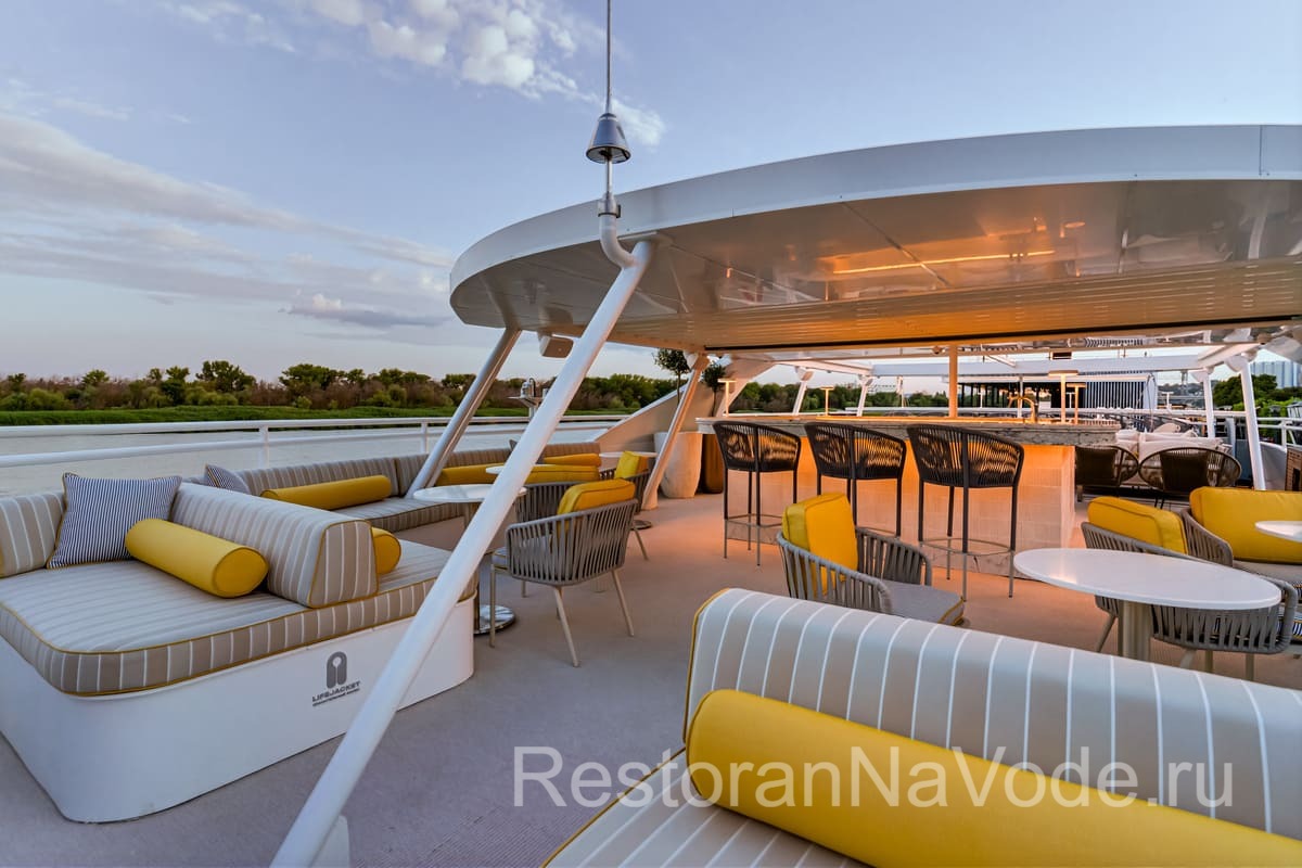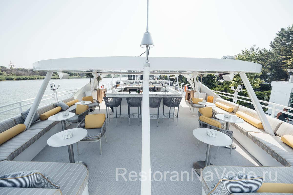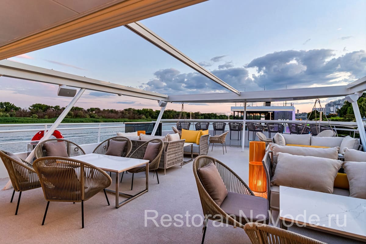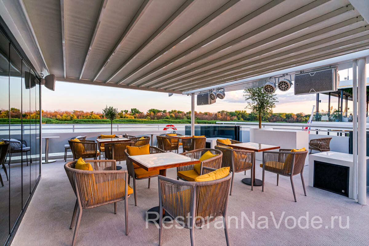 Вторая палуба оборудована контактным баром, здесь же есть банкетная зона на 20 человек. Это место идеально подходит для камерных мероприятий. На самой верхней палубе имеется раздвижная крыша от непогоды и жгучего солнца. Здесь можно расположится на мягких диванах и любоваться проходящими пейзажами.
