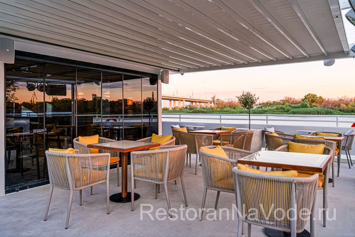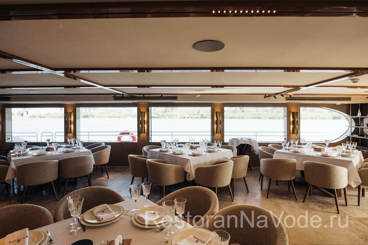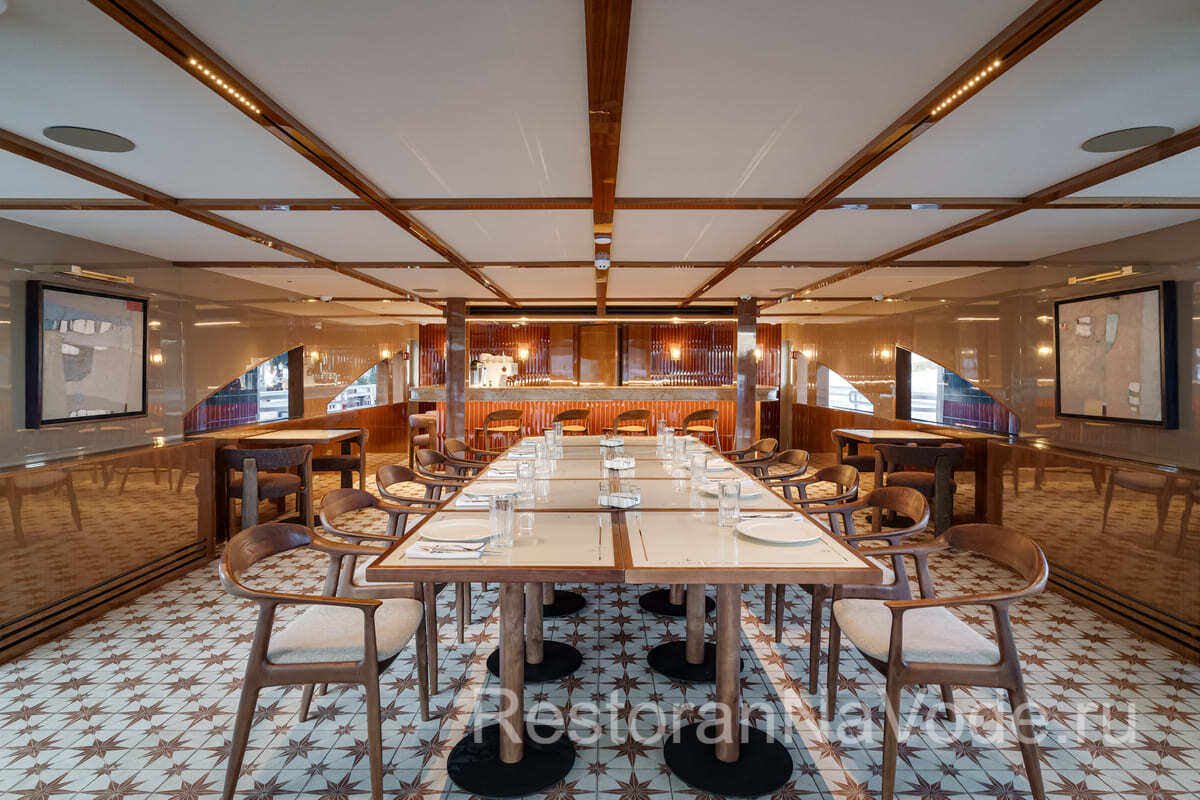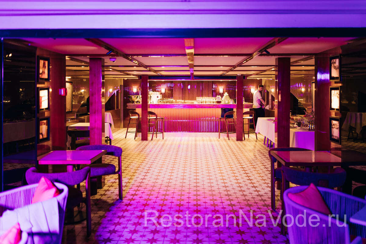 Вторая палуба оборудована контактным баром, здесь же есть банкетная зона на 20 человек. Это место идеально подходит для камерных мероприятий. На самой верхней палубе имеется раздвижная крыша от непогоды и жгучего солнца. Здесь можно расположится на мягких диванах и любоваться проходящими пейзажами.